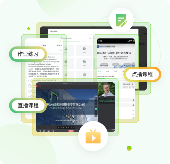 • 點播、直播、PPT、作業練習、在線討論等12+教學方式,打造“教學測評練管”線上學習閉環。